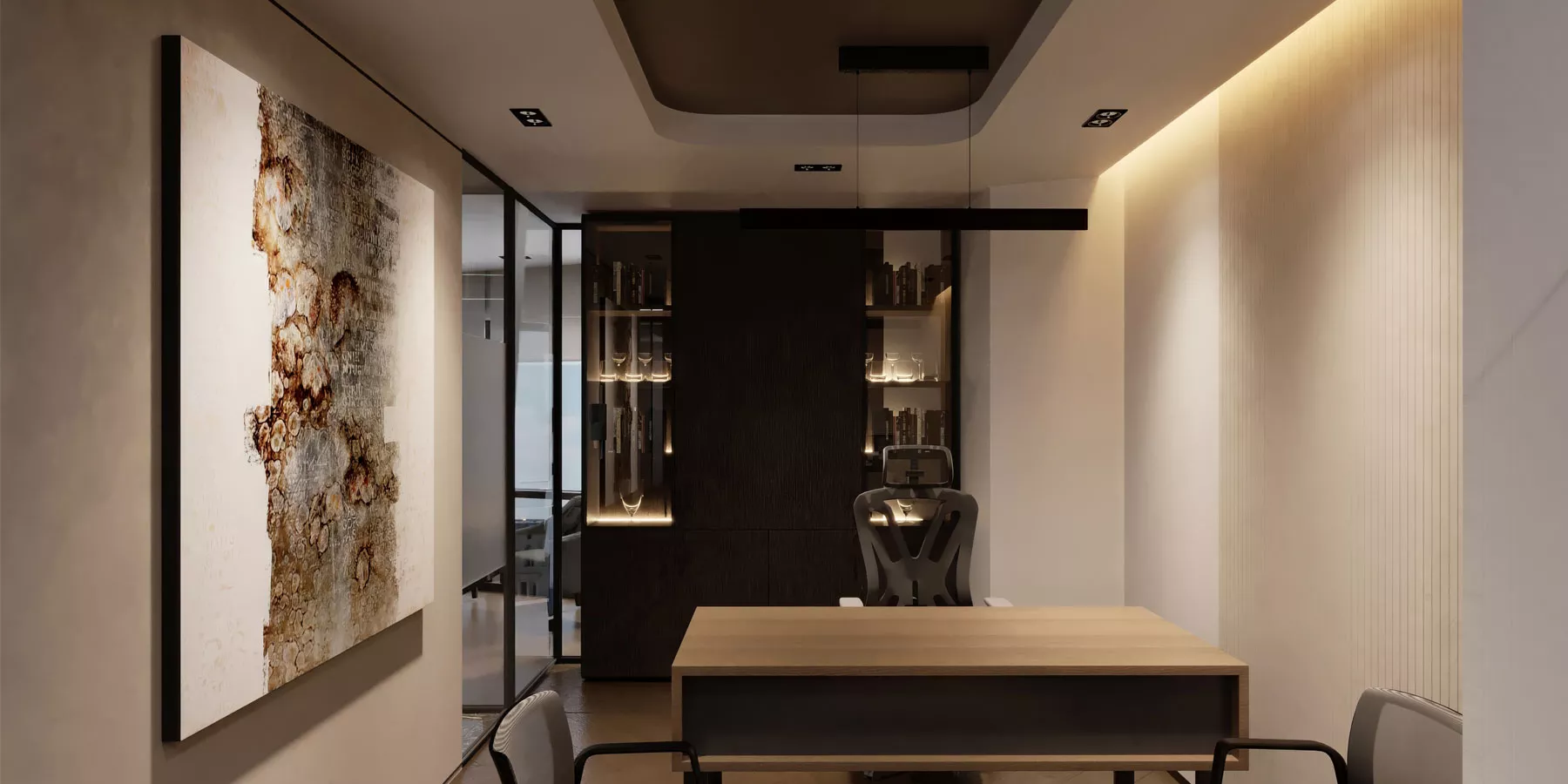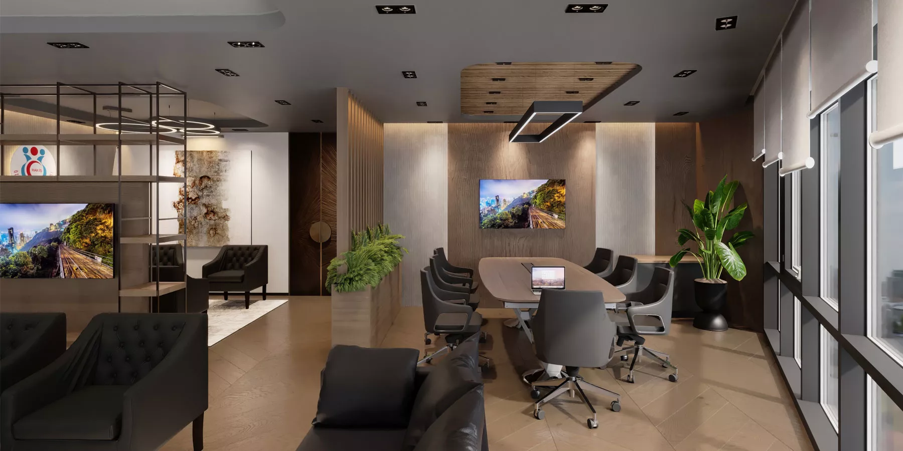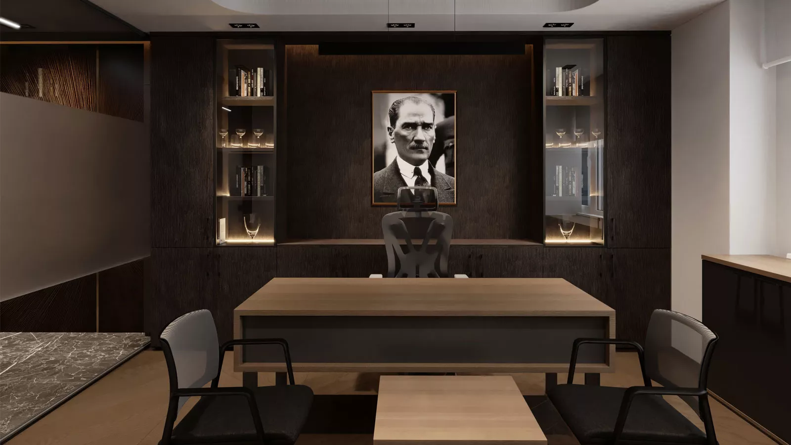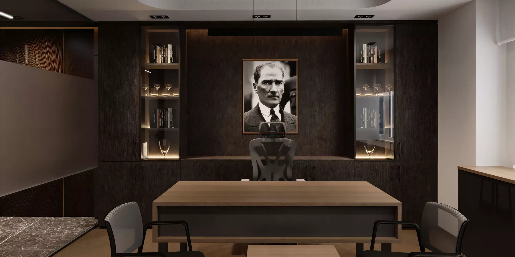 Projede kullanılan mimari detaylar ve malzeme seçimleri profesyonel bir çalışma ortamı oluşturacak şekilde tasarlandı. Mekânın hem temsil gücü hem de kullanıcı konforu tasarım sürecinde ön planda tutuldu.