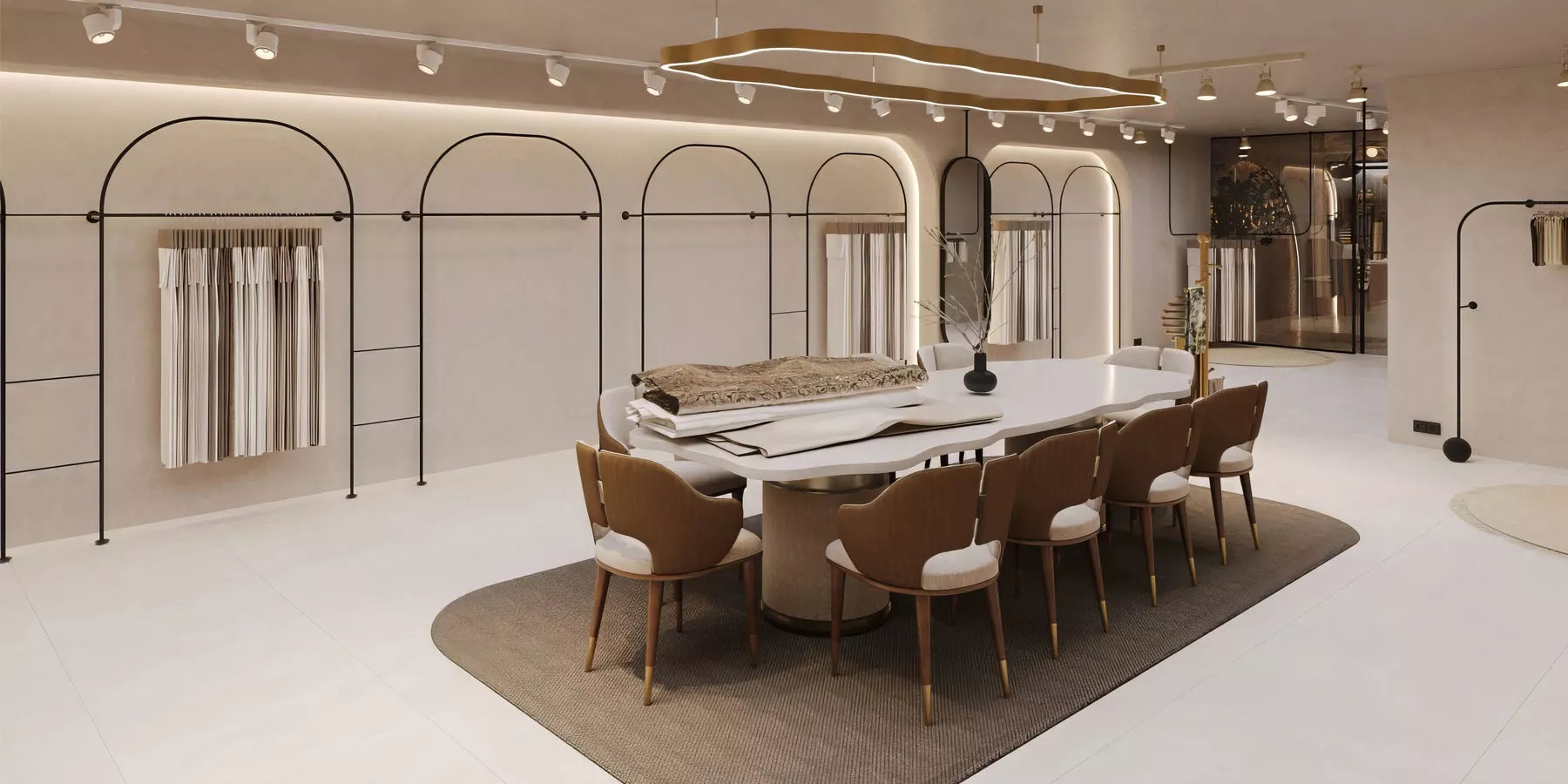 Showroom içerisinde kullanılan özel tasarım ürün sergileme sistemleri, kumaş koleksiyonlarının hem estetik hem de fonksiyonel biçimde sunulmasını sağlayacak şekilde geliştirilmiştir. Farklı doku ve renk gruplarının rahatlıkla incelenebileceği modüler teşhir elemanları, kullanıcı deneyimini ön planda tutan bir düzen içerisinde kurgulanmıştır. Aynı zamanda merkezde konumlandırılan geniş toplantı ve sunum alanı, marka temsilcileri ile müşteriler arasında profesyonel görüşmelerin gerçekleştirilebileceği prestijli bir atmosfer sunmaktadır.