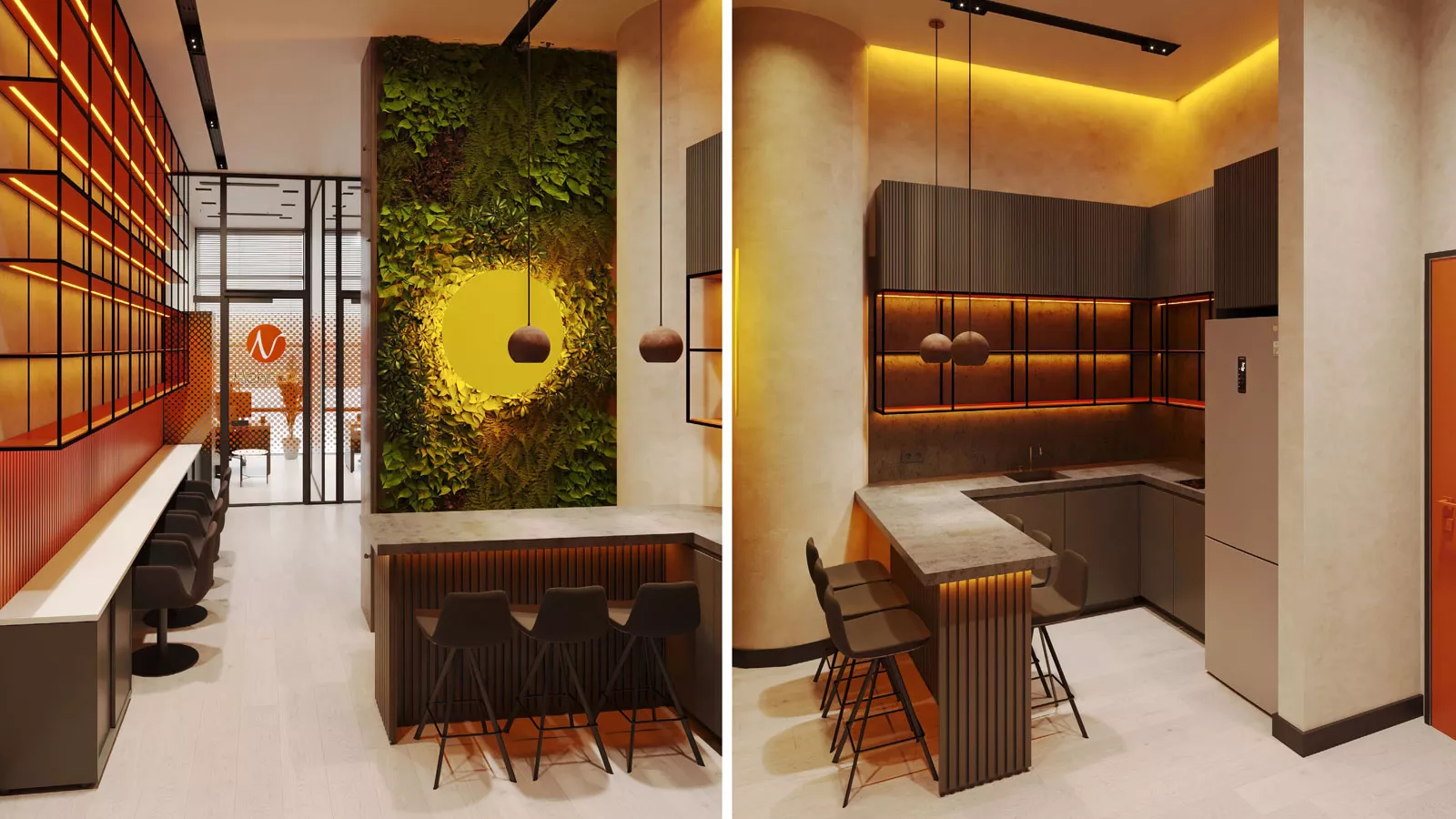 Projede dikkat çeken unsurlardan biri, dikey bitkilendirme ile desteklenen vurgu duvarıdır. Bu yüzey, hem mekâna derinlik kazandırmakta hem de doğal bir odak noktası oluşturarak kullanıcı deneyimini zenginleştirmektedir. Aynı zamanda lineer raf sistemleri ve aydınlatma entegrasyonu ile oluşturulan duvar kurguları, mekâna ritim ve süreklilik kazandıran önemli tasarım elemanlarıdır.